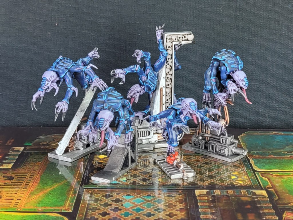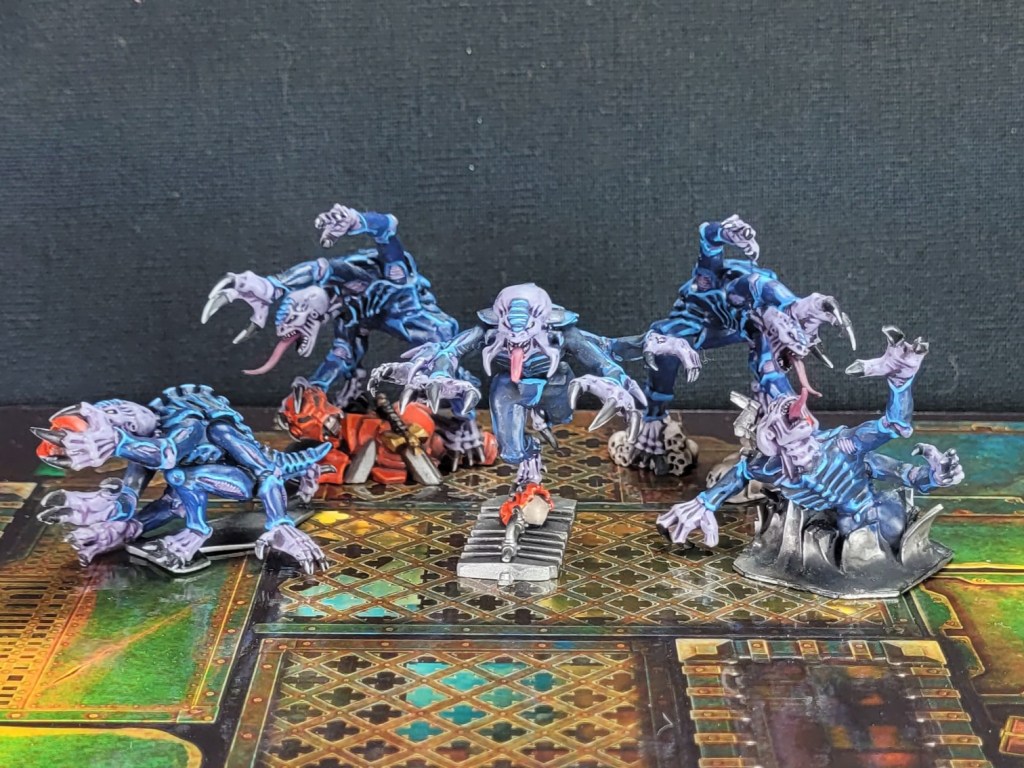I then made the second mistake of doing this whole thing with a batch painting process, which was absolute misery! Batch painting 22 genestealers meant undercoating all of the purple on all 22 models, then the blue on all 22, then the black on all 22 and so on. Absolutely soul crushing stuff!