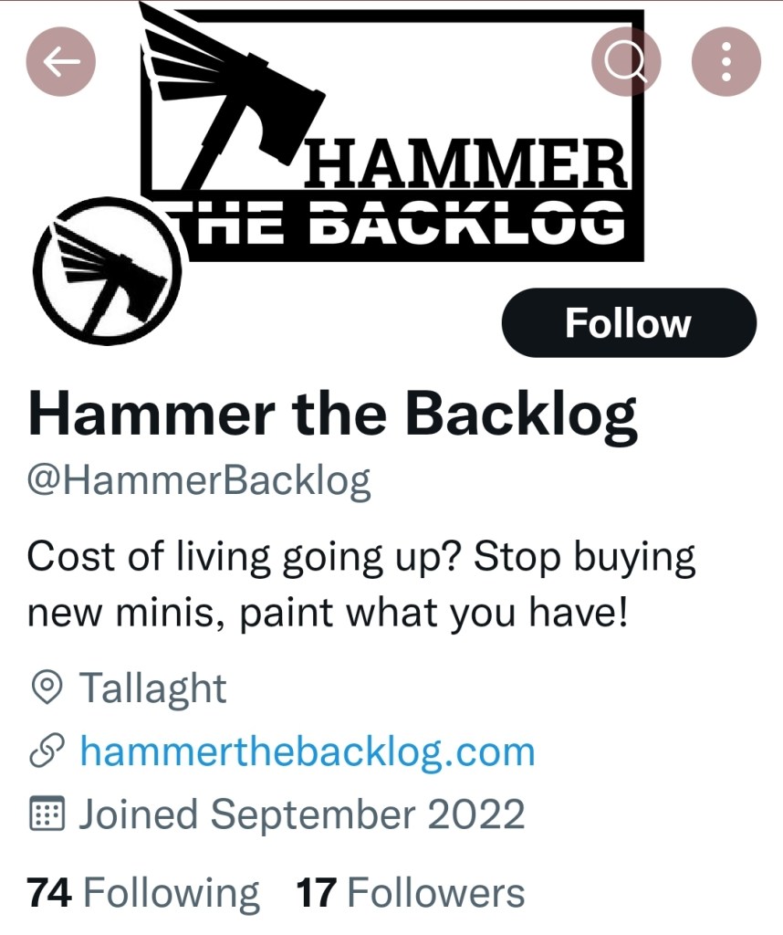 Oh, also, I started a Twitter account. I am not going to use it for anything other than doing automated announcements of blog updates using the WordPress Jetpack feature, but if you want to give it a follow, have a look for @HammerBacklog. HammertheBacklog was too long!