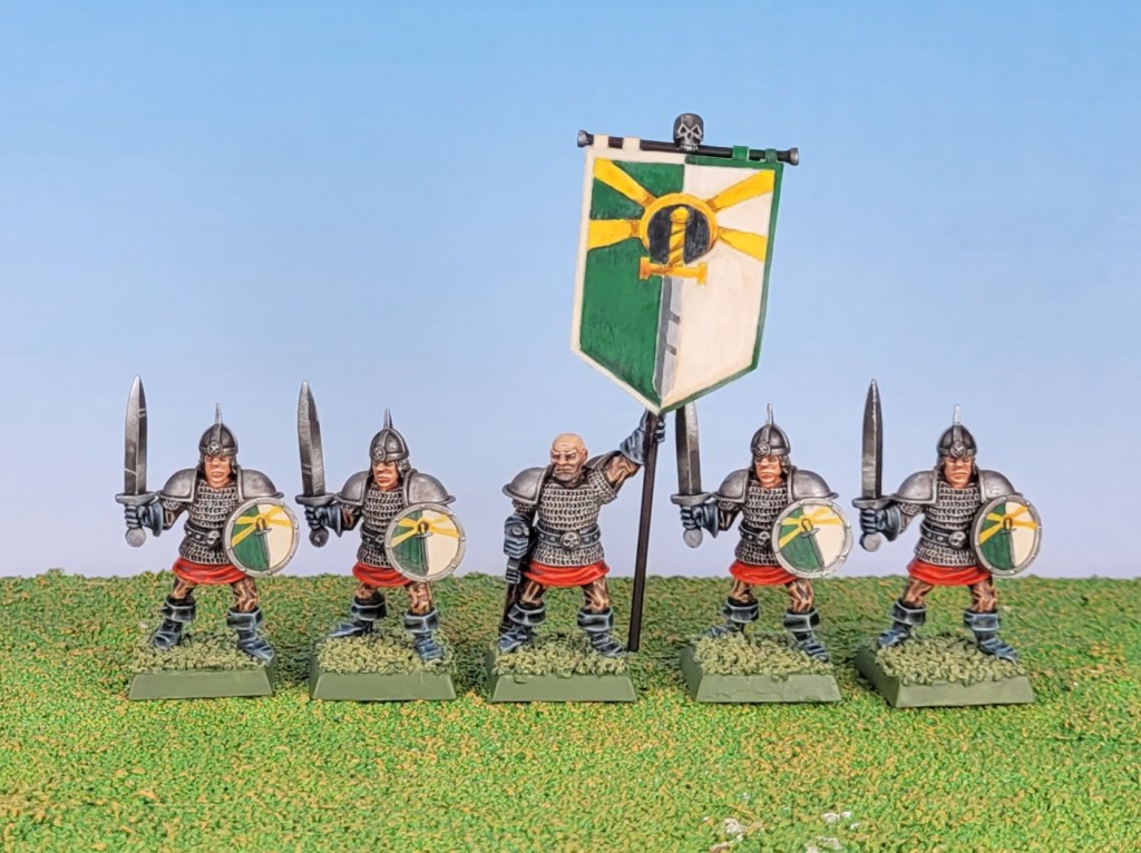 The last four rank and file mercenary swordsmen and their banner bearer were this week’s models. Once again, I thoroughly enjoyed painting them. I had forgotten that when I picked last week’s models I had chosen the examples that needed the least work, so this little group needed a little bit more filling and scraping to hide some minor bubbles.