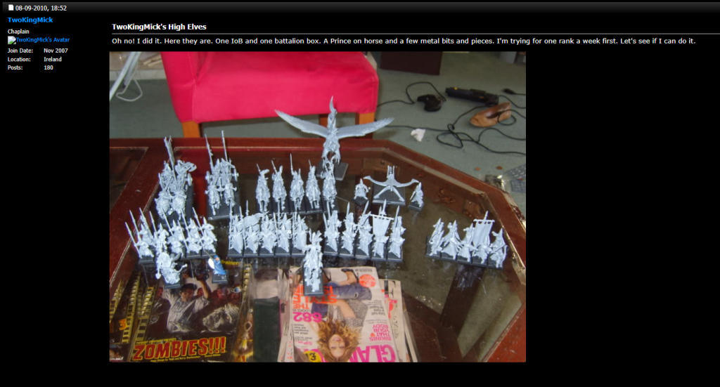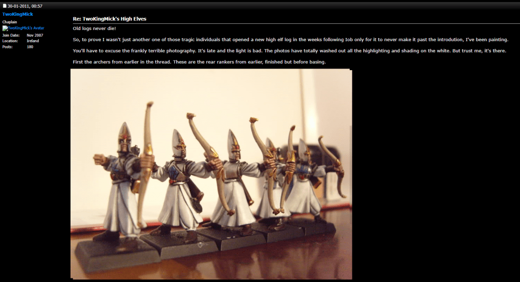 So as you can see here, on the 8th of September, 2010 I (very) half-heartedly (kinda) committed to painting a rank a week of a decently sized High Elf army that I had impulse bought. What’s most interesting for me in this is that even twelve years ago I was thinking around 5 models a week! Fast forward a week, nothing. Two weeks, nothing. Three weeks? Nada! In fact the next post doesn’t come until the 30th of January, 2011, nearly 4 months later! That’s aout 15 weeks! I must have been very busy painting away and not updating the blog.