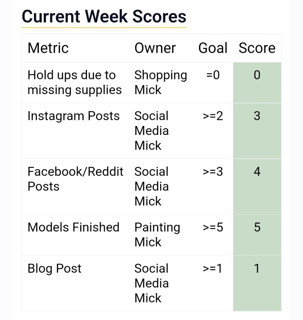Since I spent so long on the banner, I didn’t have time to photoshop the full regiment onto a 90’s style box this week, leaving the first target at 90% complete. Still, a good start to the quarter!