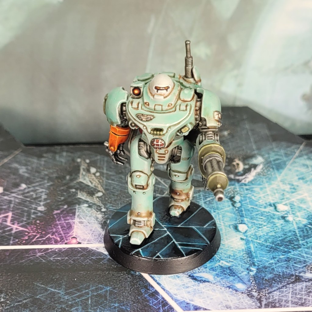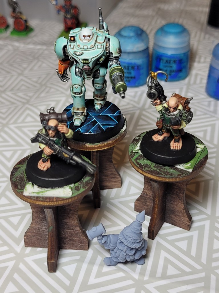 I started Rein and Raus and UR-025 a few weeks after I got the Blackstone Fortress set in 2018/2019. I managed to get the base colours down, being particularly happy with the light, 1950’s appliance style blue on the robot, before the variety of details, textures and colours on each of them hammered me into a decision paralysis that I never recovered from, leaving them unfinished. What colour should I paint this 2mm apple? Red? Green? Red with a green patch? Yellow, like a Golden Delicious? Is it a Granny Smith? What colour is bread 38,000 years in the future? Bread coloured? Is that Snakebite Leather? A fuck it, I’ll just play videogames instead.