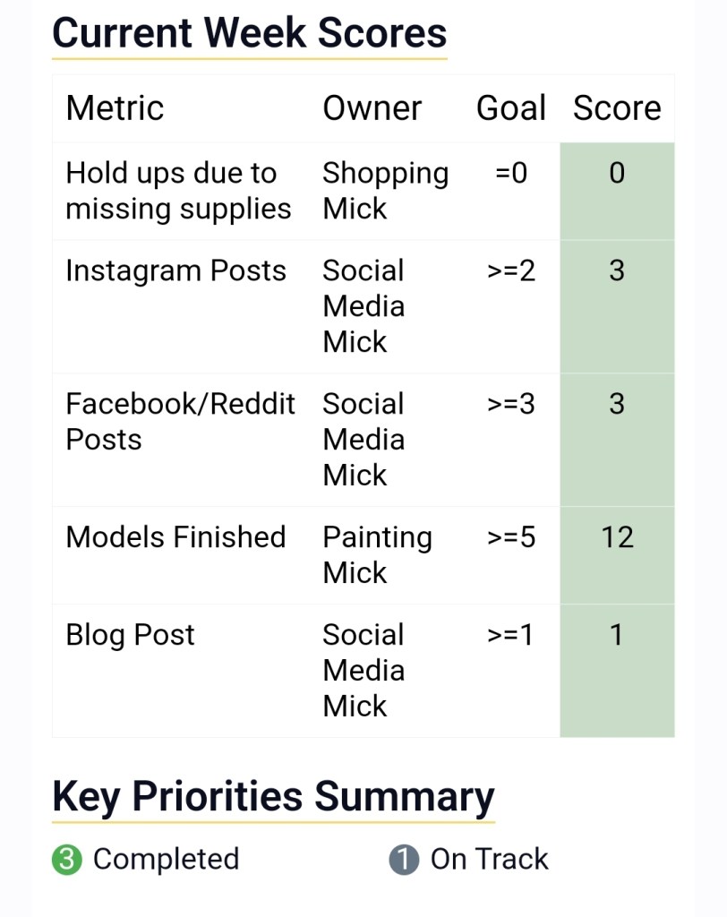Hello ladies and gentlemen and others, and welcome back to a very big week of Hammer the Backlog, the weekly warhammer miniature painting, accountability and productivity blog. This week, with four weeks left to go in the quarter, we managed to tick off three of the four main targets. Let’s start, as we so often do, with a look at the Scorecard.