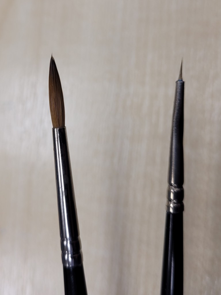 The Winsor and Newton size 2 hasn’t hurt either! Even though I‘ve been using Series 7s for years, I was buying increasingly smaller and smaller brushes, getting down to brushes the size of a human eyelash. This was definitely the wrong idea for the way that I paint. The relatively ginormous size 2 has a pin point tip and a big enough body that it can hold the paint and flow well without clogging up the brush. It delivers wet paint exactly where you want it without the frustration of much smaller brushes. It has been, as they say, a Game Changer.