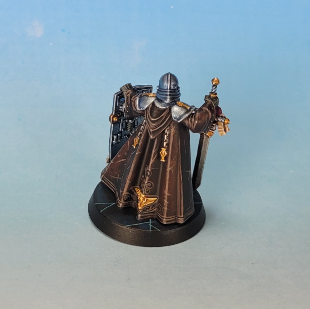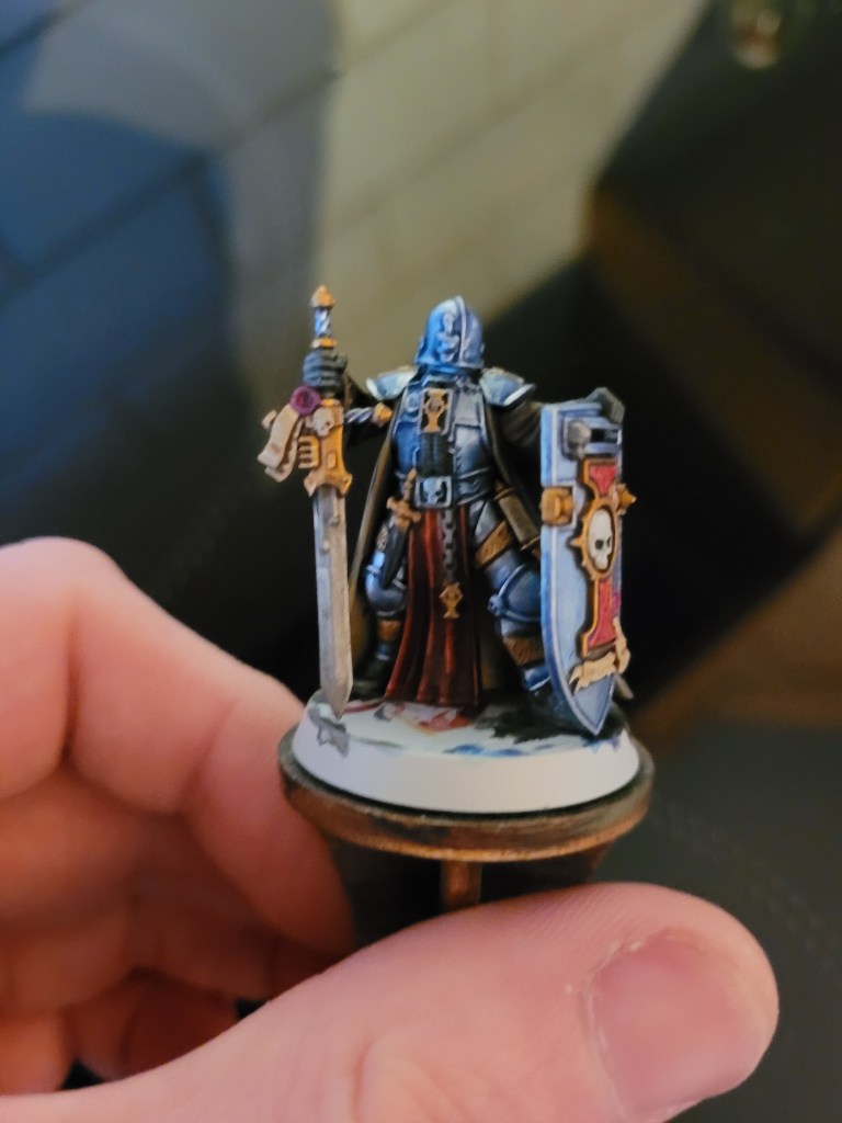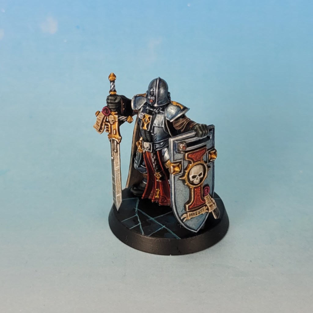 Gotfred was an interesting challenge to paint, mostly because I have never really liked the “Blue Steel” look that GW uses for modern Grey Knight and Crusaders. But, since I have skewed so close to the box art on everything else for this project so far, I decided to give it a try. This was the process.