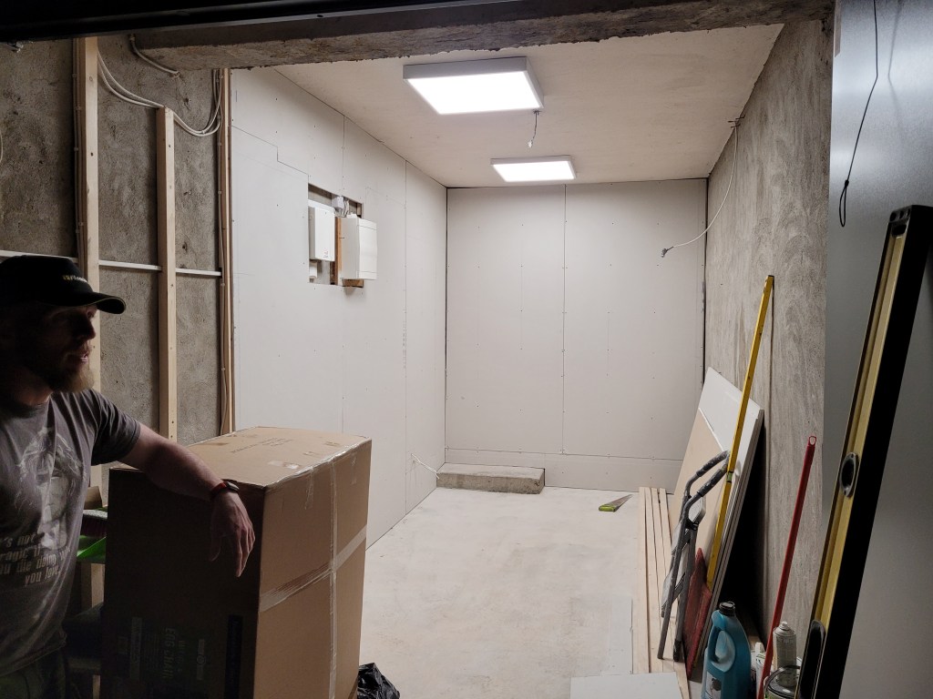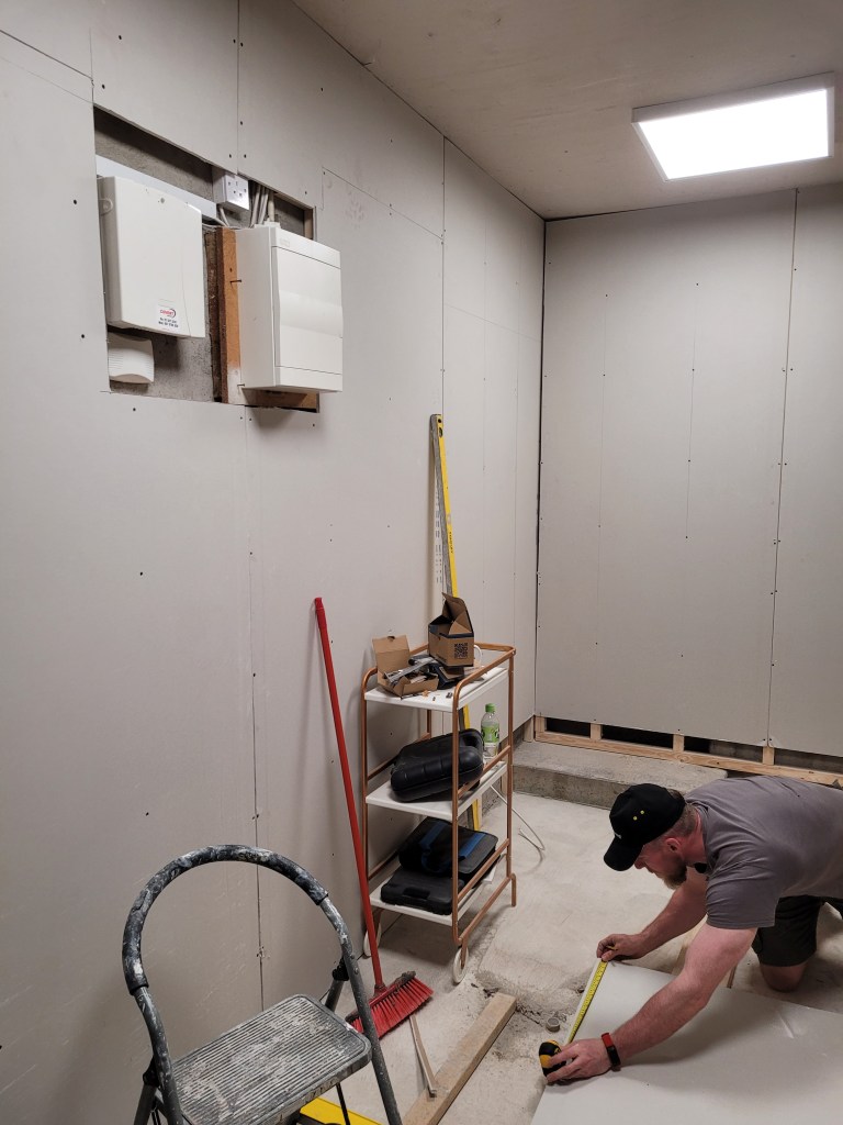 It was no easy feat slabbing the two interior walls of the garage entirely on my own, but in the end through dedication, strength and brainpower, I did manage it. Here is a picture of me with my World’s Greatest Handman mug as proof that I did it entirely on my own with the sweat of my own brow.