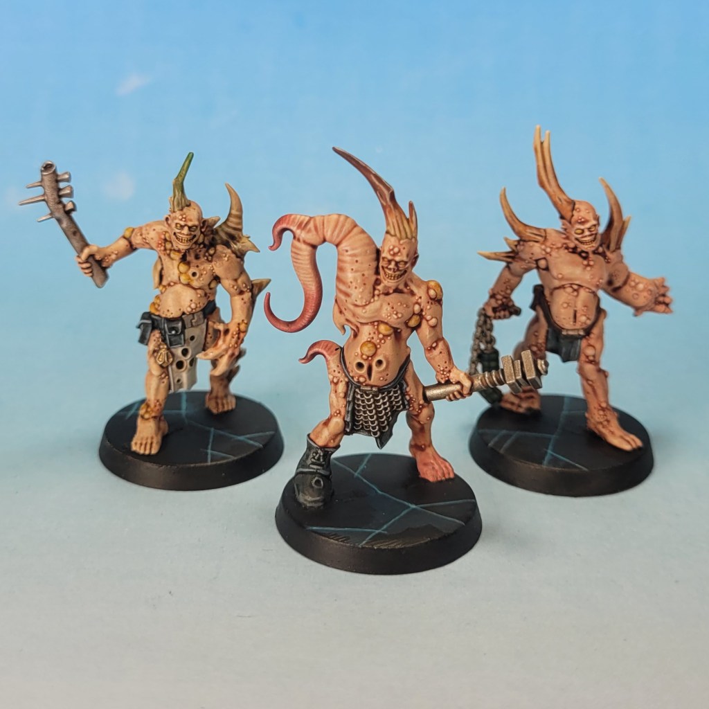 I tried to use a variety of different skin tones on the models by using different contrast flesh colours mixed with different ratios of Volupus pink. This means that I don’t really have a recipe, as such, which will make duplicating these guys in future quite hard! But, when you have an unwashed mass of gross sickly bois, I suppose it makes sense that none of them would be exactly the same.