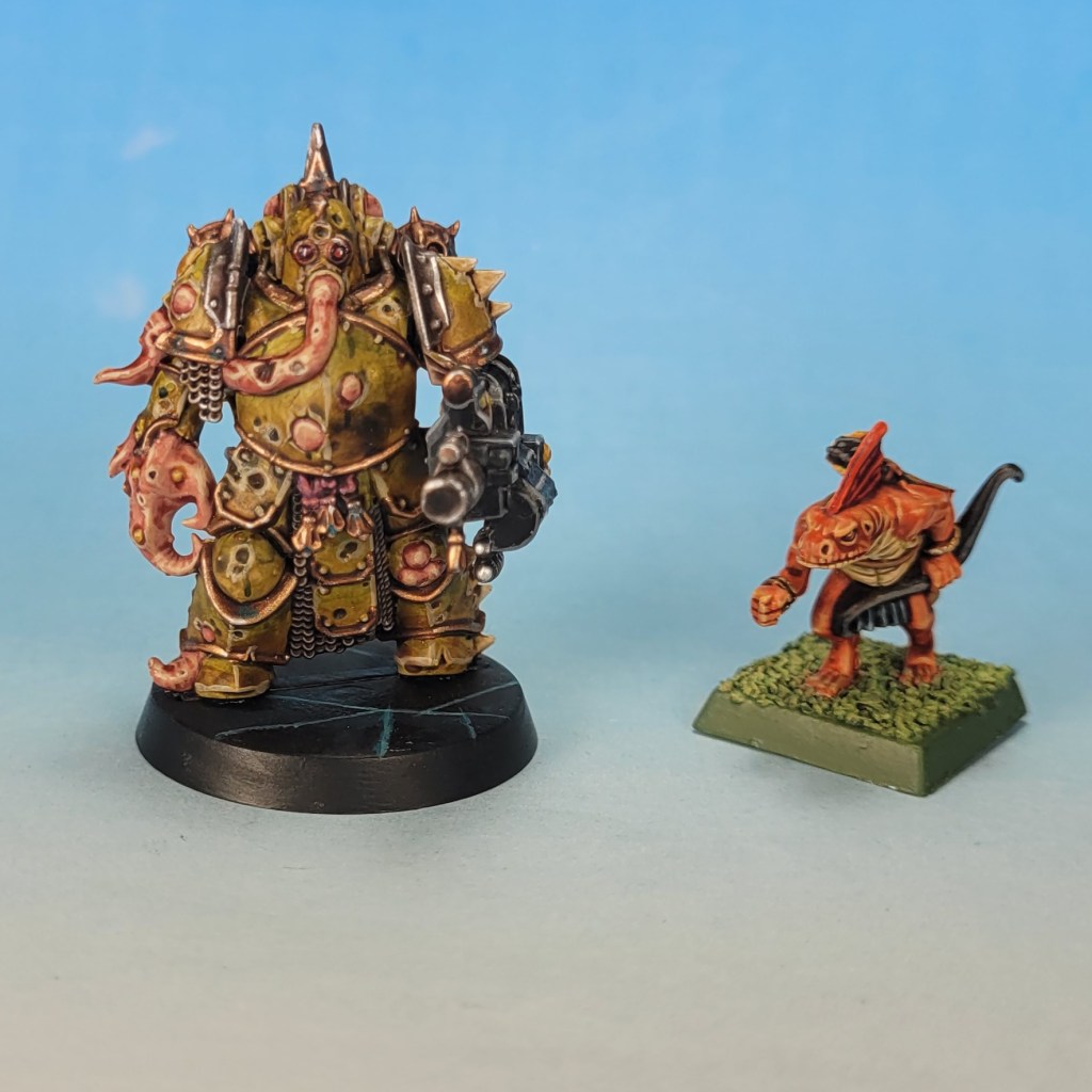 I have also decided this week that, going forward, anything larger or more complicated that a tactical space marine will count as two models. So Terminators, Primaris, recent Chaos Marines etc, will all be two points each. I think this is pretty fair, otherwise a terminator sergeant gets the same amount of time dedicated to painting him as the 14th skink in a unit of 30.