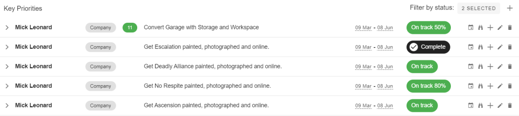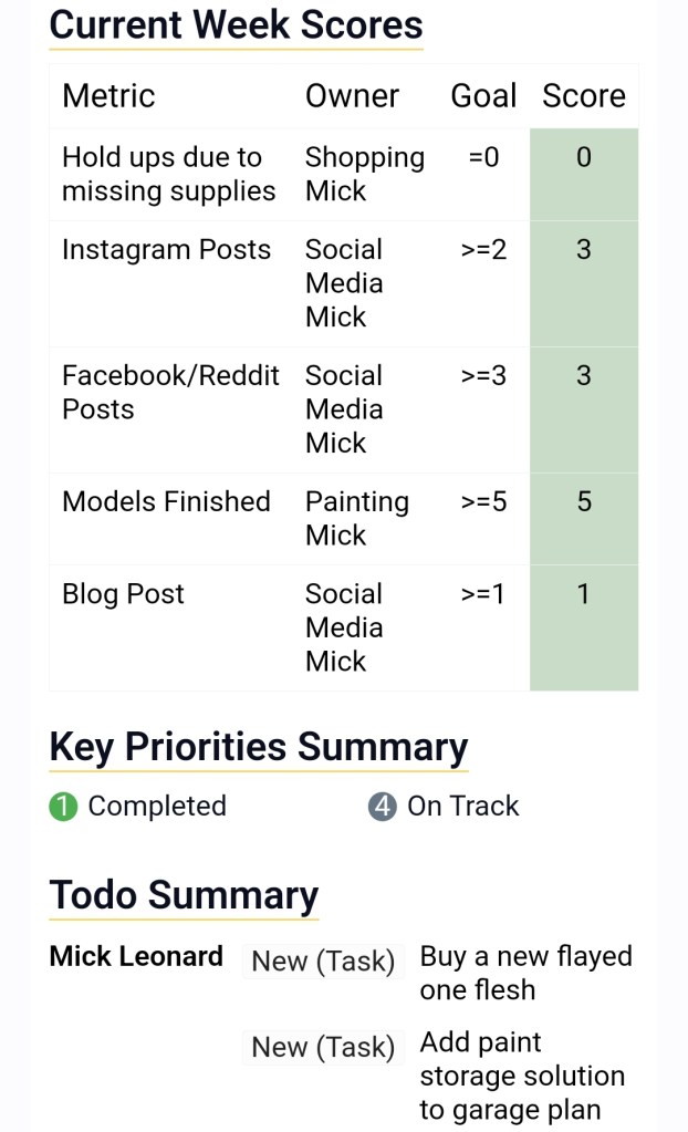 The victim here would have been the scorecard, which would have only had three models completed this week and would therefore have been in the red. However! As I decided a few weeks back, any and all finished models count to the scorecard number, so I plucked out one of the very nearly finished plague marines, did up his base and counted him as two models. In the end, healthy progress on the Key Priorities and the Scorecard and no decision paralysis. A win all round!