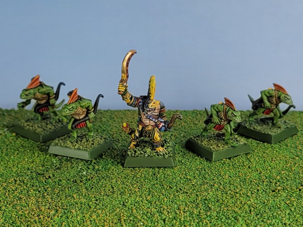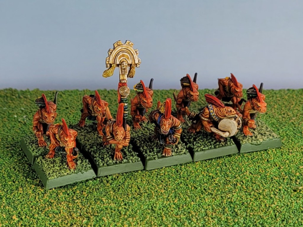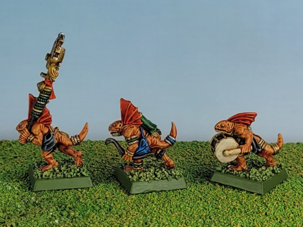 The standard bearer and musician were painted exactly the same way as my previous batch of orange skinks, which is fitting since they’re going to be leading them.