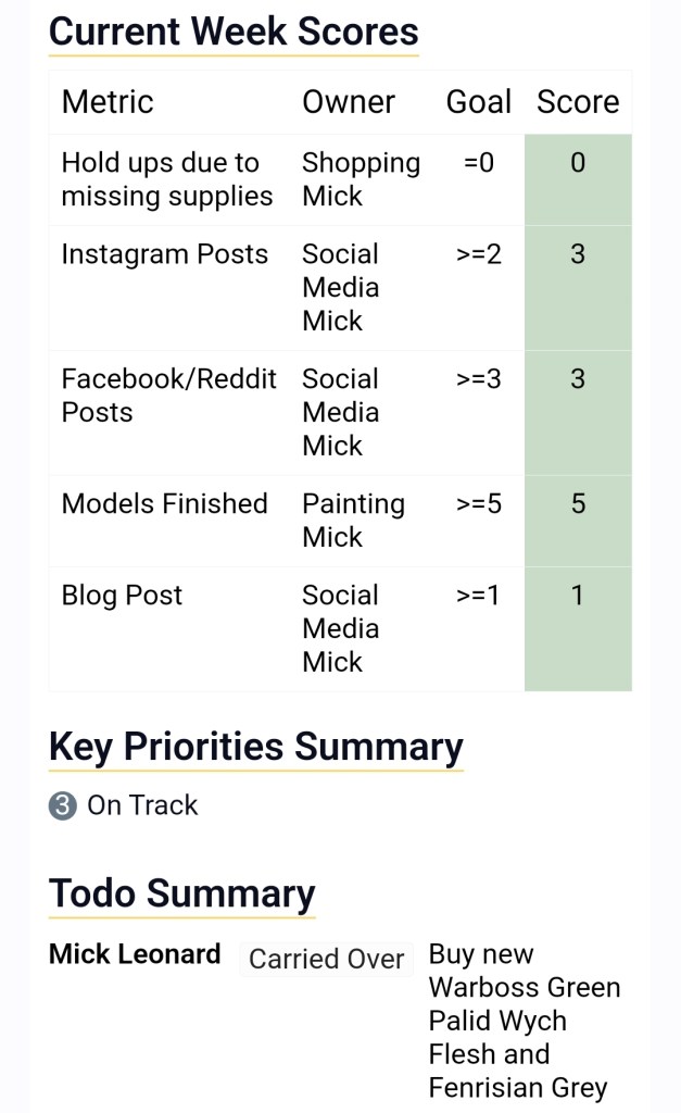 The final thing is the weekly meeting. The weekly meeting is where I check in on the scorecard, check the progress on the rocks, deal with any problems that have popped up, and then write the whole thing out and present it to you, the beautiful readers, as a blog.