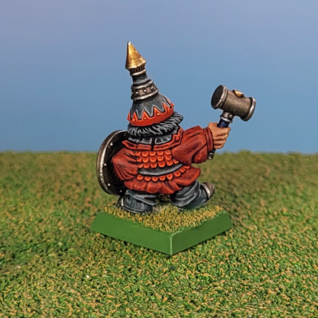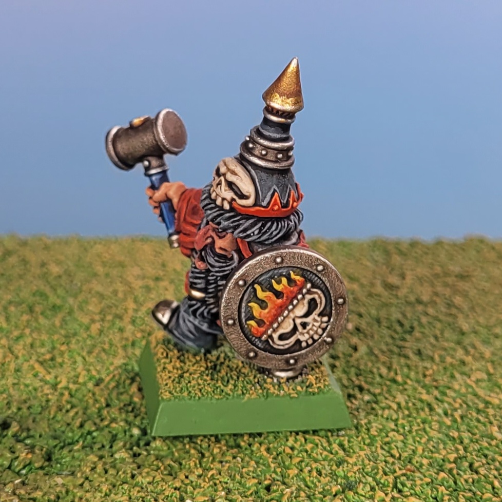 As an amuse bouche, I painted up this fantastic angry little Chaos Dwarf warrior with a hammer and shield to be the unit champ for my blunderbusses. Fabelzel, just like GW back in the day, doesn’t seem to have been too interested in making a warrior command group and a blunderbuss command group.