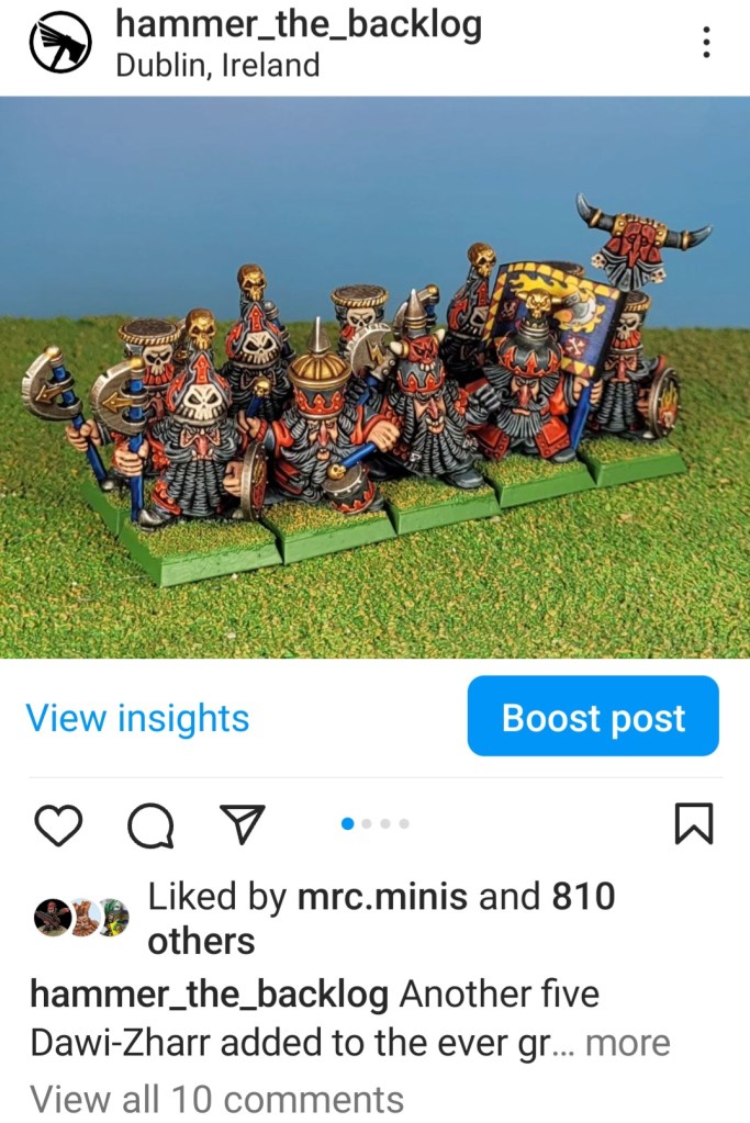 It has been a very good week on social media this week. The Chaos Dwarfs are very popular on instagram, easily the most popular thing I’ve painted since the Bretonnains in quarter 1 of year 1. Many of the photos are getting upwards of 800 likes and this will probably only increase as they become a recognisable army. Instagram growth is also on the up again, with probably 3300 follows by the end of this week.