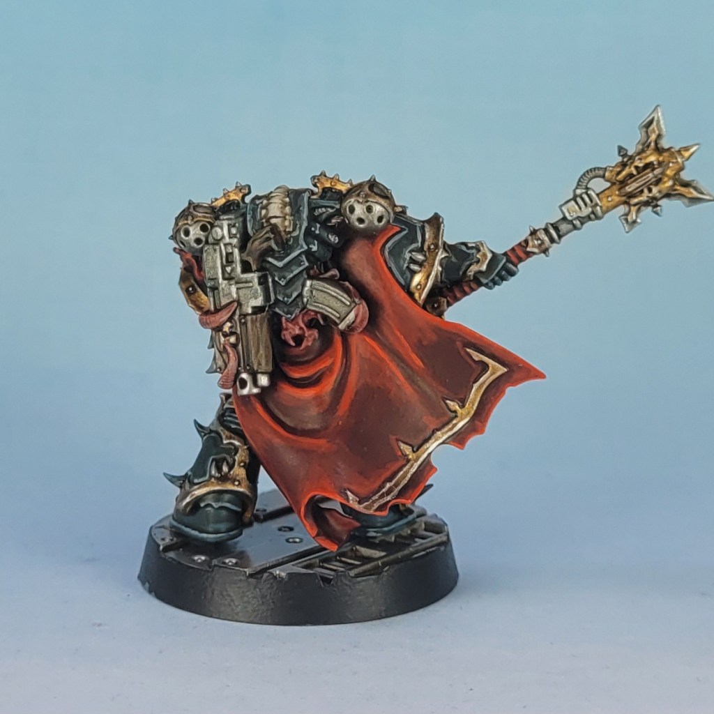 The last model of this week is the Chosen Champion. This guy gives off real Dark Apostle vibes with his mace and bare head. He was quite fun to paint with his lovely, luxurious cloak covering up most of his backside and therefore nearly halving the amount of trim and armour to be painted! I’ve never been so happy to paint a big, red cloak.
