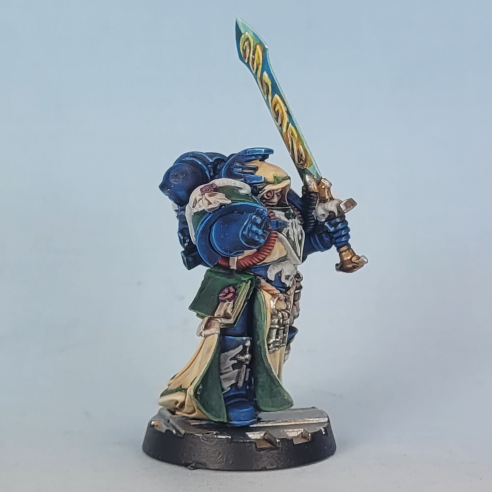 This guy’s sword was painted exactly the same way as the other power swords in the set, then the runes were painted over with corax white and painted with contrast yellow paints. They are definitely yellow. Any appearance of a non-metallic metal gold effect is purely accidental.