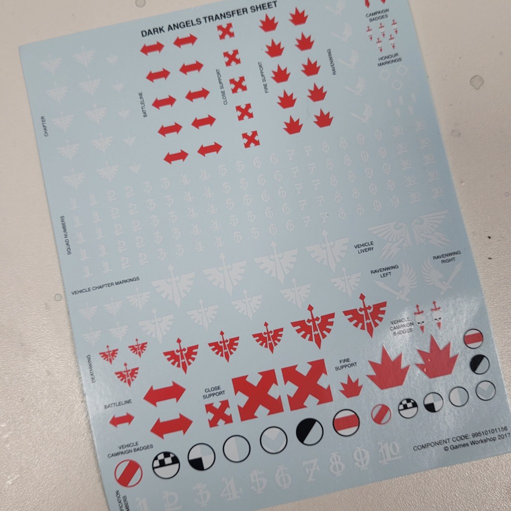 With everything in the green and only two models left to go, I started having a bit of time back to get other things done. One of those was to order a Dark Angels transfer sheet. I’m going to use some of my freed up time over the next couple of weeks to get squad and company markings on everything I’ve painted so far.