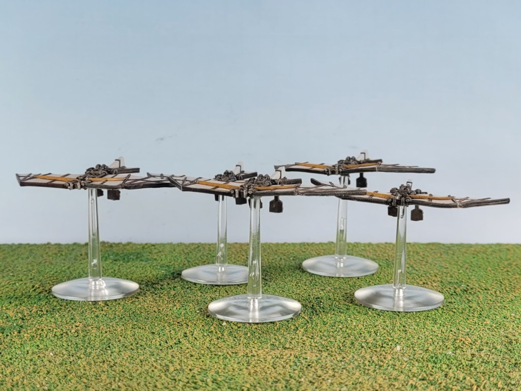 In the end, I basecoasted them off white. Then I painted the struts and supports with Wyldwood. This was messy and covered a lot of the white. Before fixing the white I painted all the metals and gave them gave them a nuln oil wash.