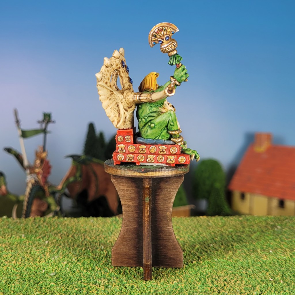 Ok, so it’s not exactly a finished model this week, since he does need four big strong temple guards to carry him around, and a pair of nice flashy standards to go on his back. But at least the meat and two veg of Big Froge the Slann Mage Priest are finished.