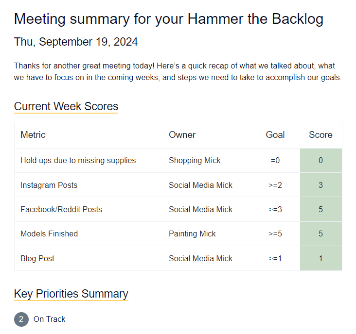 The final thing is the weekly meeting. The weekly meeting is where I check in on the scorecard, check the progress on the rocks, deal with any problems that have popped up, and then write the whole thing out and present it to you, the fabulous readers, as a blog.