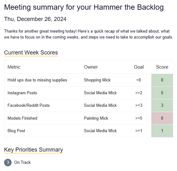 The final thing is the weekly meeting. The weekly meeting is where I check in on the scorecard, check the progress on the rocks, deal with any problems that have popped up, and then write the whole thing out and present it to you, the beautiful readers, as a blog.