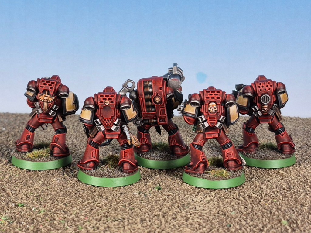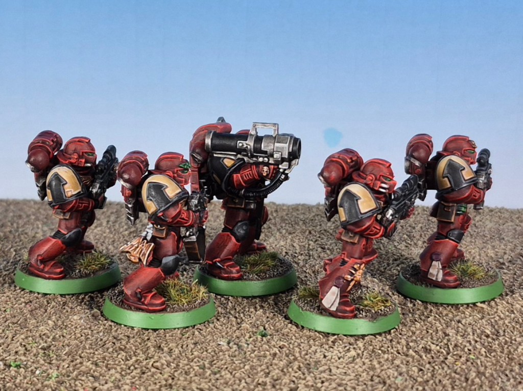 They were quite a bit more fun to paint than I thought they were going to be. I was dreading painting the armour, trying to get a smooth contrast coat and then all of that edge highlighting. It was a lot of work in the end and at times it felt like I was making no progress whatsoever. But! The cool thing about these guys is that once all that green red is done, the model is pretty much done too. Unlike with chaos marines they are not covered in trim and gribbly bits. Only a few touches of other colours to get them done.