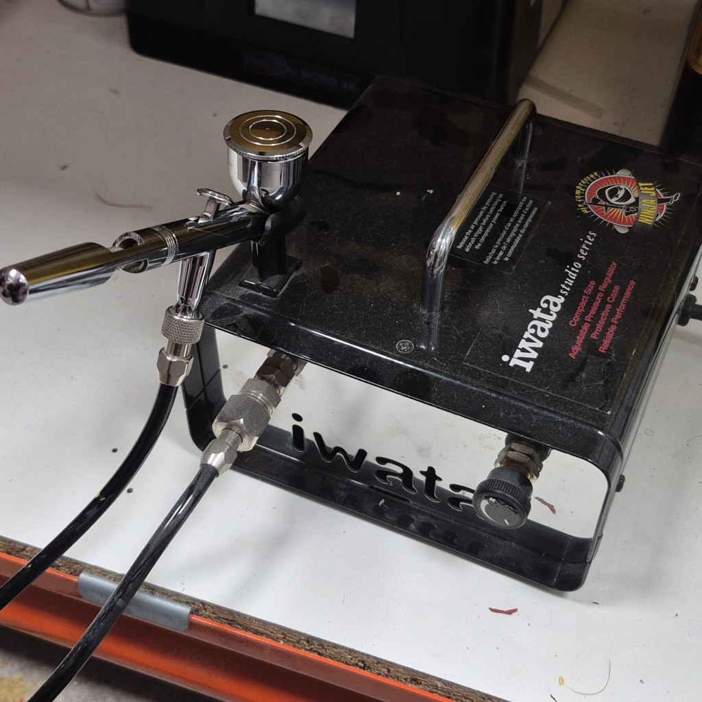The next step was to bust out my underused Iwata airbrush. My lovely girlfriend bought this for me from a hobby shop in Japan more than 10 years ago, and I’ve never really got the hang of it. The whole cleaning process of airbrushes has always put me off, and I think I damaged a valve in it a few years ago with over enthusiastic application of alcohol, but since I haven’t used it in four years, I kinda forgot and just went with the flow and had great fun and loved the results.