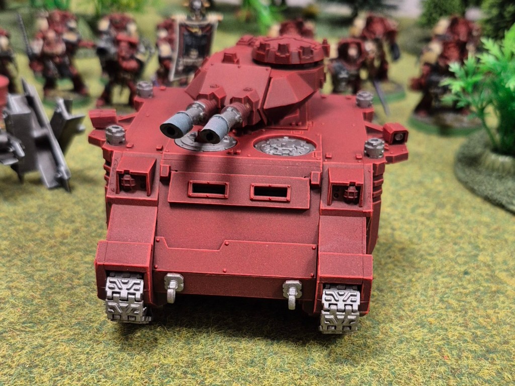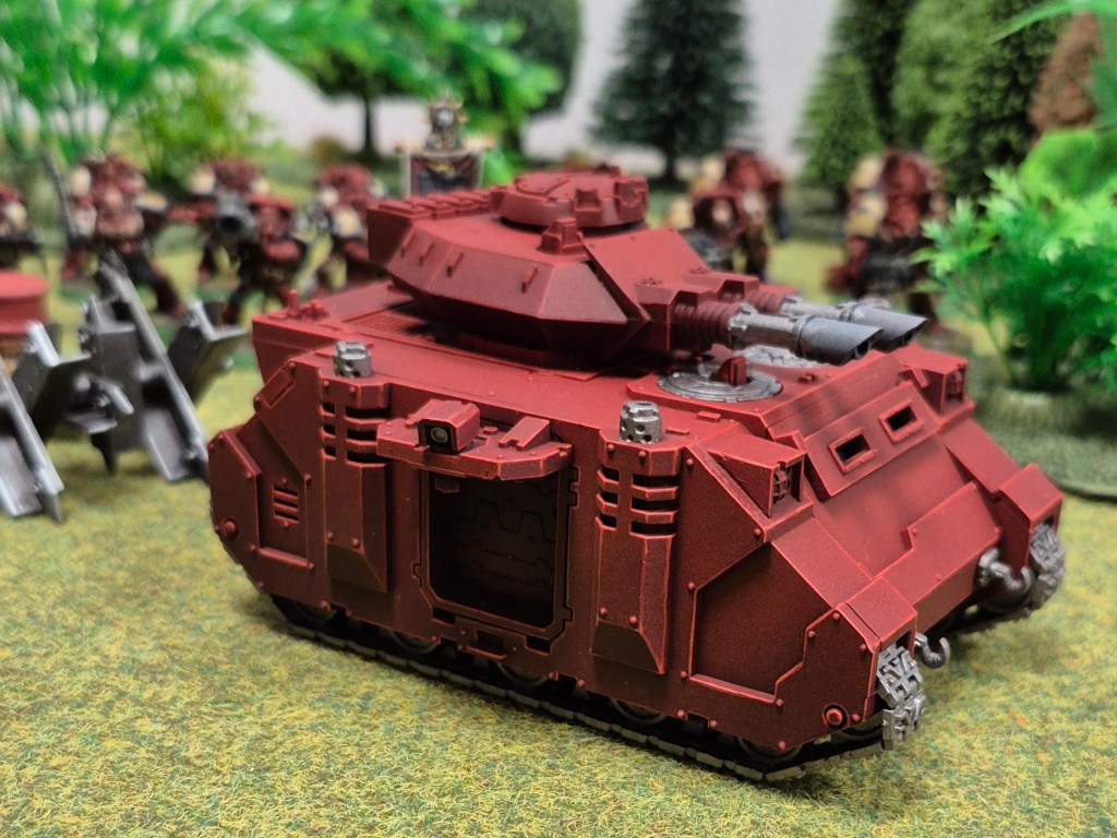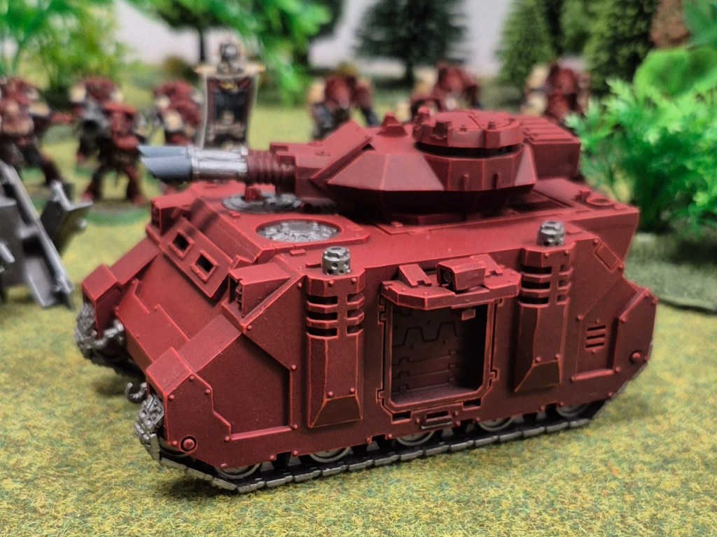 I am going for the blood raves as they appeared in Dawn of War One, so the predator doesn’t get any bone panels. If I ever do a rhino for this force, they would get bone coloured doors.