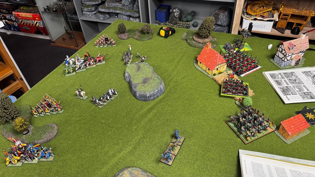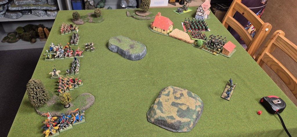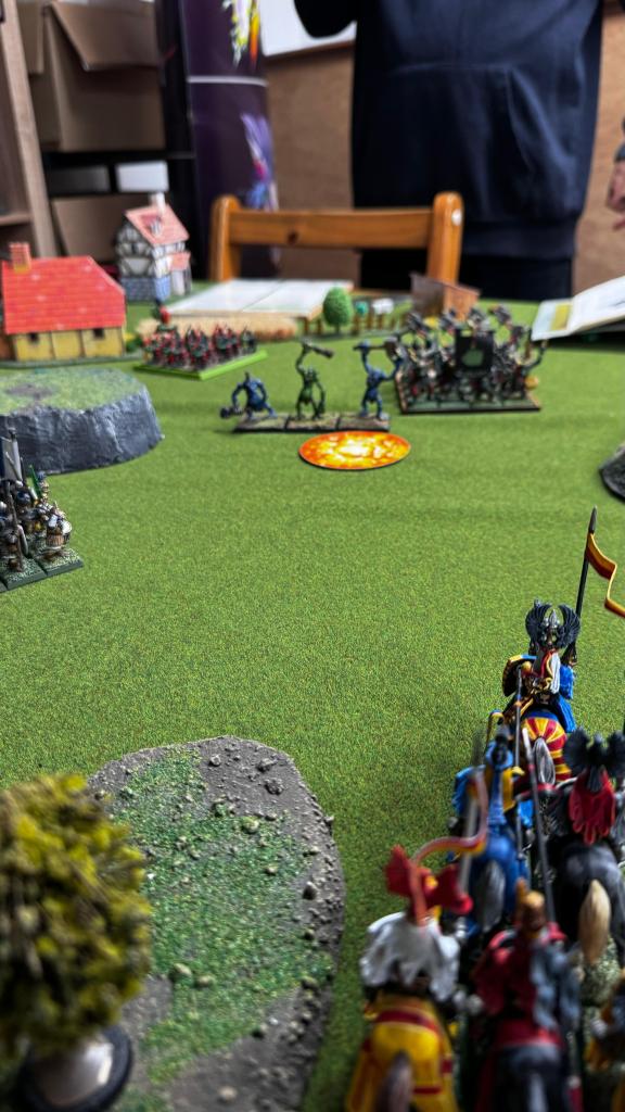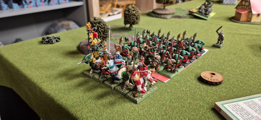 Approaching the town and seeing the foul greenskins lining up, the Duke saw no infernal gunpowder weapons or other dishonourable weapons of war, and so didn’t stop to pray for the Lady’s blessing. Instead, he would goad the greenskins out of the town with peasant bowfire and then smash the Orcs apart under lance and hoof when they over stretched themselves.