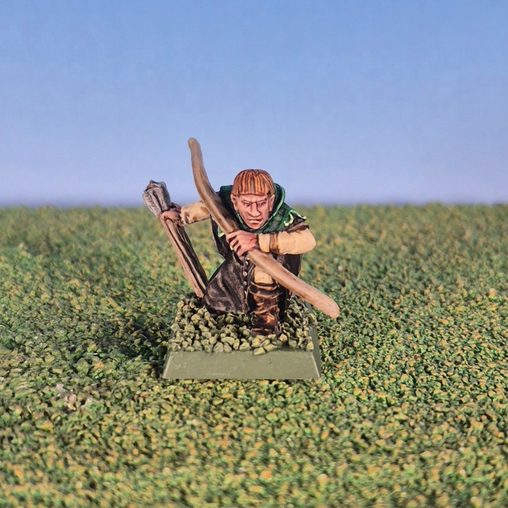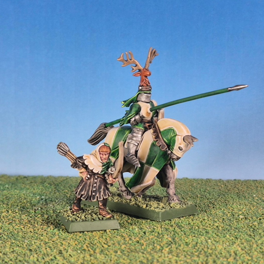 So I went for light and dark leather tunics, with each squire wearing a hood that matched the heraldry of a particular knight from one of my knights of the realm units. The idea being that the squires have all been banded together into a unit to go and beat the ground ahead of the knights and flush out prey from them to hunt down.