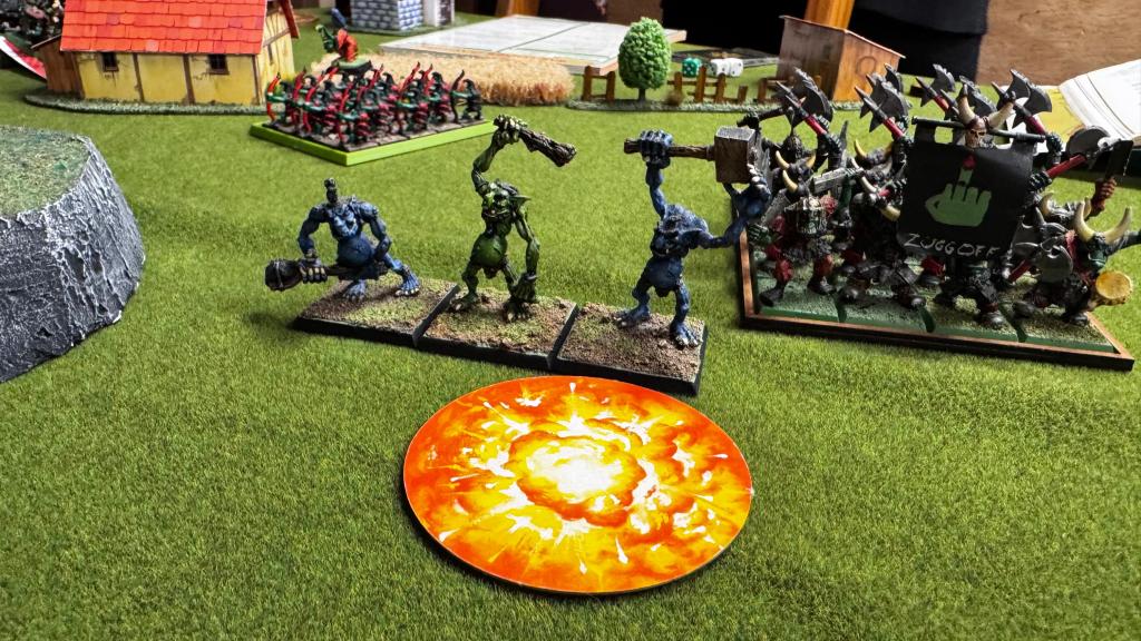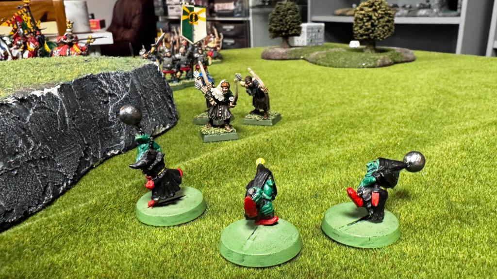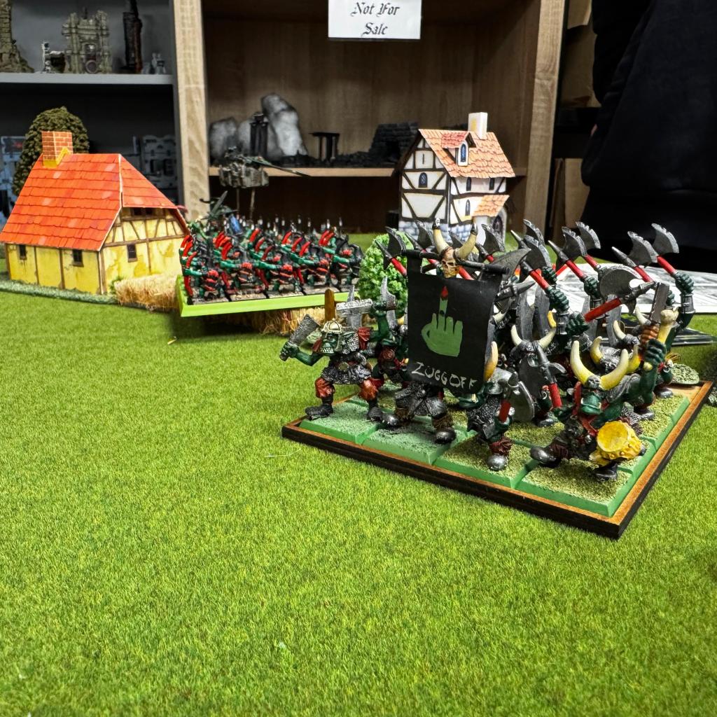 A rowdy bunch of Orcs and Goblins, seemingly on the trail of some hidden treasure (almost certainly a product of their bizarre “minds”) stumbled across the small Bretonnian village of Petite Village. Finding it full of wine and beer and humans to fight, it seems like they decided to stay.