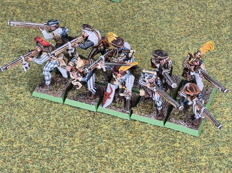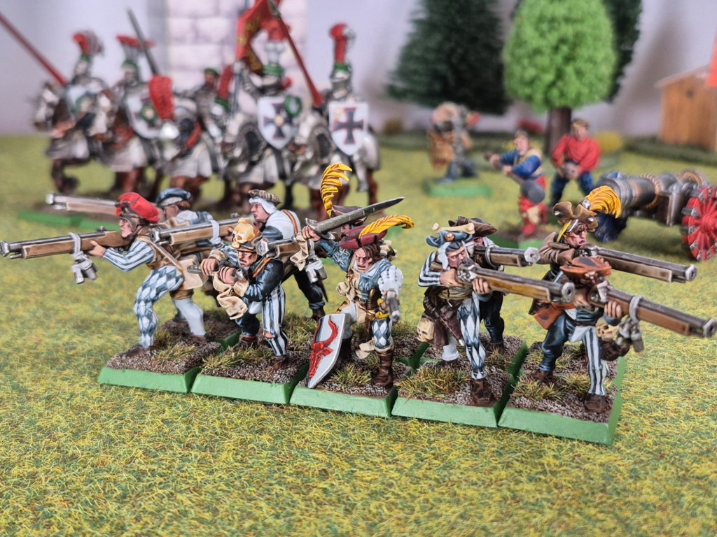 So five more handgunners painted up in the white and black colour scheme of Ostland. They were a little easier to paint up than last week’s models, with the template for the colour schemes and style established.
