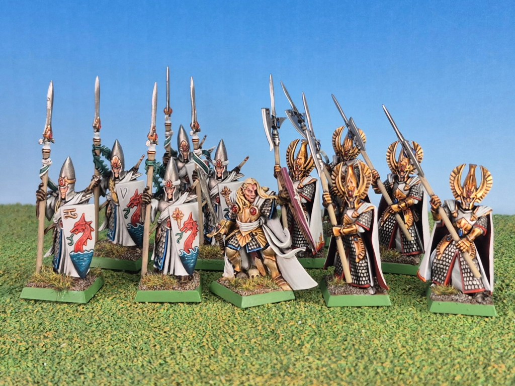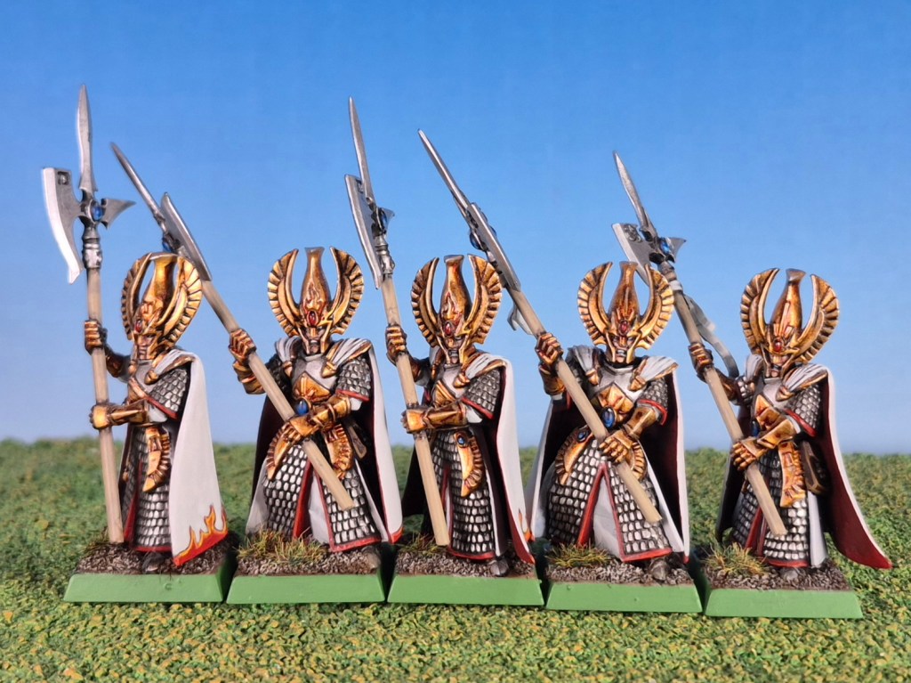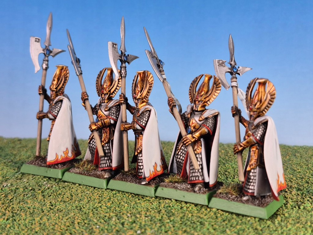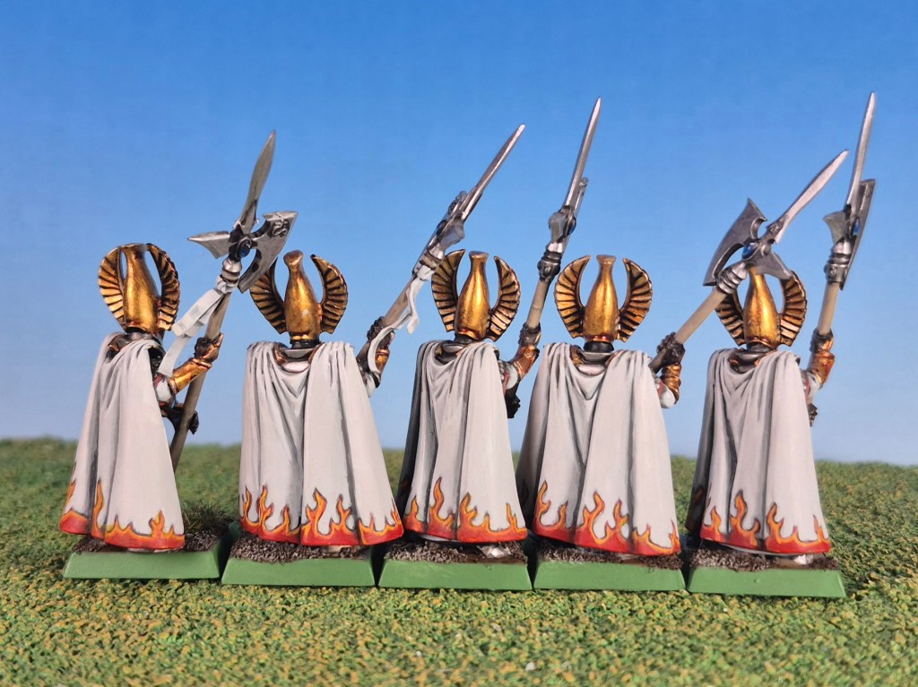Five rear rankers from the Phoenix Guard this week. For me, there has always been a bit of tension around units like this. The Phoenix Guard are the guards of the Shrine of Asuryan, right? So they should probably be pretty uniform, especially compared to citizen militia? And they might join a random prince’s army, but not really be part of it. It’s more like they are there on secondment. So it didn’t make a lot of sense for me to paint them in matching colours to the main body of my army, my archers, seaguard and reaver knights. So they won’t be getting blue and pink accents.