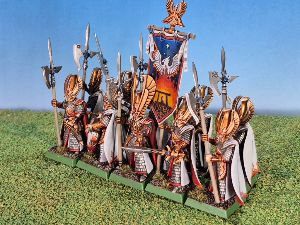 This week’s models are better painted than last week’s, but there is a slight but noticeable difference in their gold tone. Last week’s seem a lot cooler (in a colour theory sense), but only on the helmet wings. The armour and rest of the helmets match exactly. I think I might have skipped the chestnut ink on the helmet wings 15 years ago to create some variety in the gold tones. When they are a unit of 20, I think it will look fine to have a slight bit of tonal variety among the unit, as long as they are not placed in the same rank.