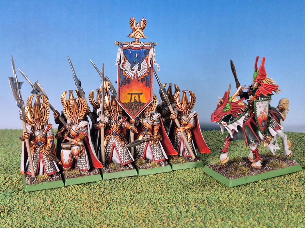One of the joys of painting this project is that other people seem to be having the same idea at the same time, so there are people to talk to about it. Paul Brown over on the Warhammer Armies High Elves Facebook group is painting up a very similar unit at the moment, and has been hitting a lot of the same problems and decisions, which is always helpful!
